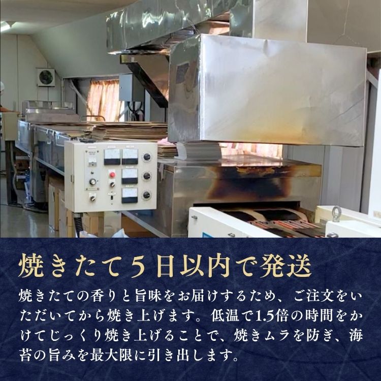 海苔の問屋メーカーの女性創業者が考案した特注のトンネル型焼き機を使用。低温で1.5倍の時間をかけてじっくり焼き上げることで、焼きムラを防ぎ、海苔の旨みを最大限に引き出します。一口食べれば、パリッと割れてふわっととろける極上の食感を実感していただけます。