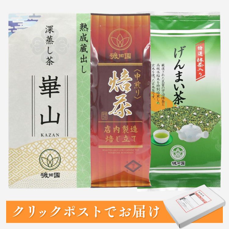 - 深蒸し茶、ほうじ茶、玄米茶の3つの味が楽しめるアソートセットです。