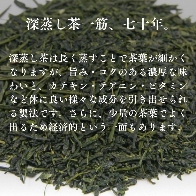 通常の煎茶よりも長く蒸すことで、渋みがやわらぎ、まろやかで濃厚な旨みが際立ちます。細かい茶葉からお茶の成分がしっかりと溶け出し、深いコクをお楽しみいただけます。